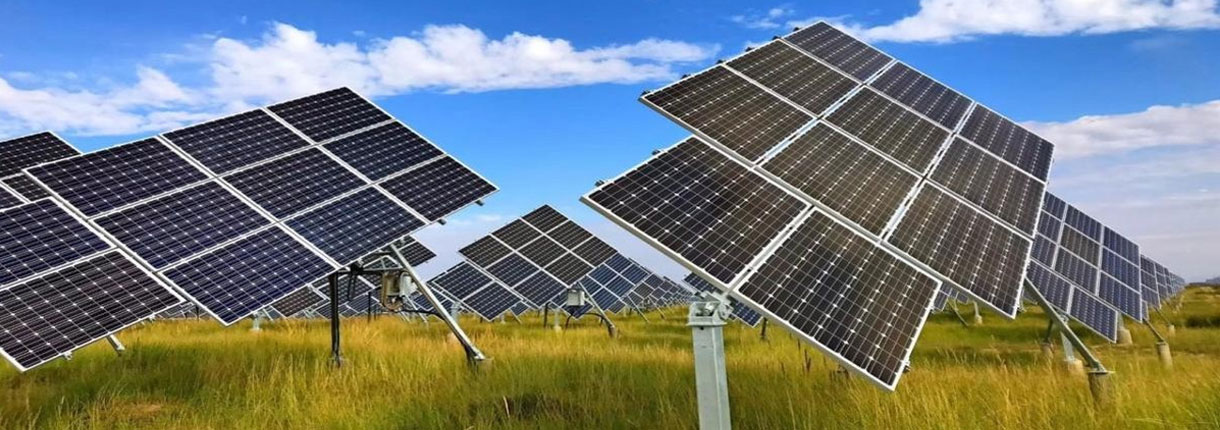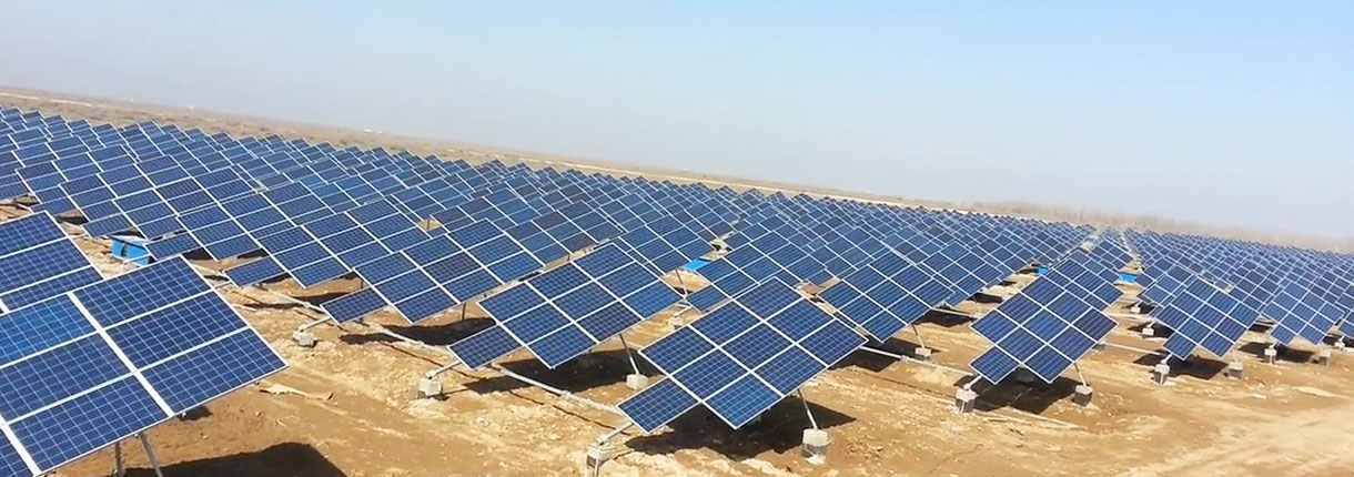 圖中是兩組平單軸跟蹤陣列示意圖,每塊電池陣列有自己的轉(zhuǎn)軸,轉(zhuǎn)軸線在與地面垂直的平面上,與地面有一個夾角,轉(zhuǎn)軸線與地軸線基本平行(春分或秋分時(shí)的地軸線)。轉(zhuǎn)軸安裝在支架上,電池陣列可繞自己的轉(zhuǎn)軸旋轉(zhuǎn),圖中黃色箭頭線表示太陽光的方向。旋轉(zhuǎn)由太陽跟蹤控制裝置控制,使電池板轉(zhuǎn)軸垂直面與太陽光平行.
